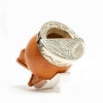 Media tapa para el mate. Realizada en alpaca, con una banda elástica para engancharlo al mate y evitar que se vuele la yerba seca.
