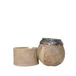 Mate uruguayo de calabaza forrada en cuero crudo con virola y guarda de alpaca cincelada a mano. Incluye base de cuero crudo.