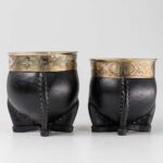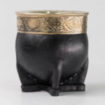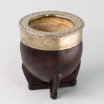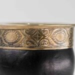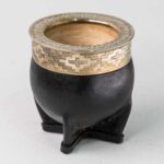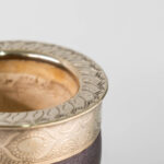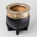 Mate uruguayo premium de calabaza forrada en cuero, con virola de alpaca cincelada y guarda de alpaca cincelada.