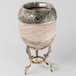 Mate uruguayo de calabaza forrado en cuero repujado, con virola de bronce y base completa de alpaca cincelada a mano calada.