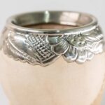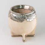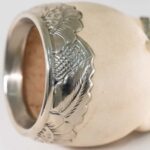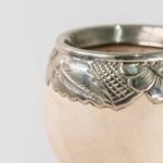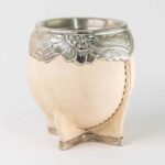Mate uruguayo de calabaza forrado en cuero repujado, con virola de bronce y base completa de alpaca cincelada a mano calada.
