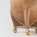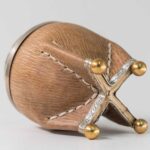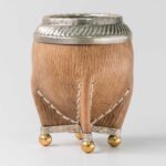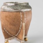 Mate uruguayo de calabaza forrado en cuero repujado, con virola de bronce y base completa de alpaca cincelada a mano calada.