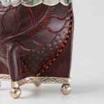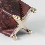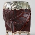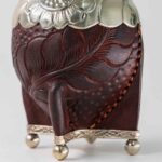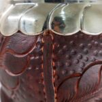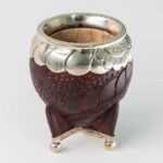 Mate uruguayo de calabaza forrado en cuero repujado, con virola de bronce y base completa de alpaca cincelada a mano calada.