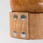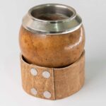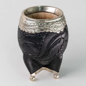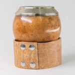 Mate uruguayo de calabaza forrado en cuero repujado, con virola de bronce y base completa de alpaca cincelada a mano calada.