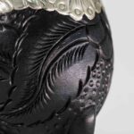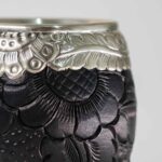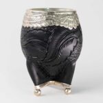 Mate uruguayo de calabaza forrado en cuero repujado, con virola de bronce y base completa de alpaca cincelada a mano calada.