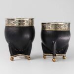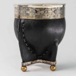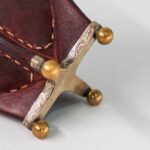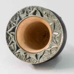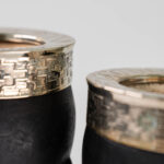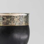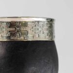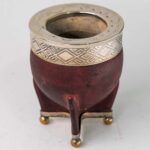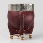 Mate de calabaza forrada en cuero con virola y guarda de alpaca cincelada a mano, con base metálica.