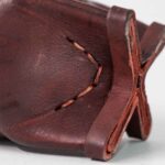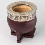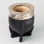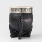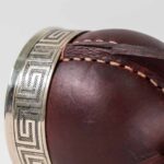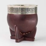 Mate de calabaza forrada en cuero con virola y guarda de alpaca cincelada a mano con base metálica.