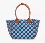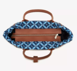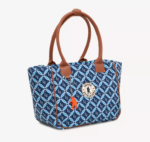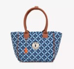 Tote de tamaño mediano, con cierre principal y bolsillo interno con cierre. Las manijas son de simil cuero a tono con la tela base. El eje de la manija es ideal para usar colgada en el hombro o a mitad del brazo. En el centro delantero tiene ubicado el logo de goma en blanco con detalles en marron.