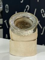Mate imperial volcado, edicion limitada. Simbolo de la tradición para quienes buscan distinción y calidad en cada detalle. Calabaza seleccionada, tratada y forrada en cuero natural, con costuras artesanales. Virola y guarda de alpaca y bronce, cinceladas a mano. Base de cuero cosida a mano, asegurando firmeza y estabilidad.
