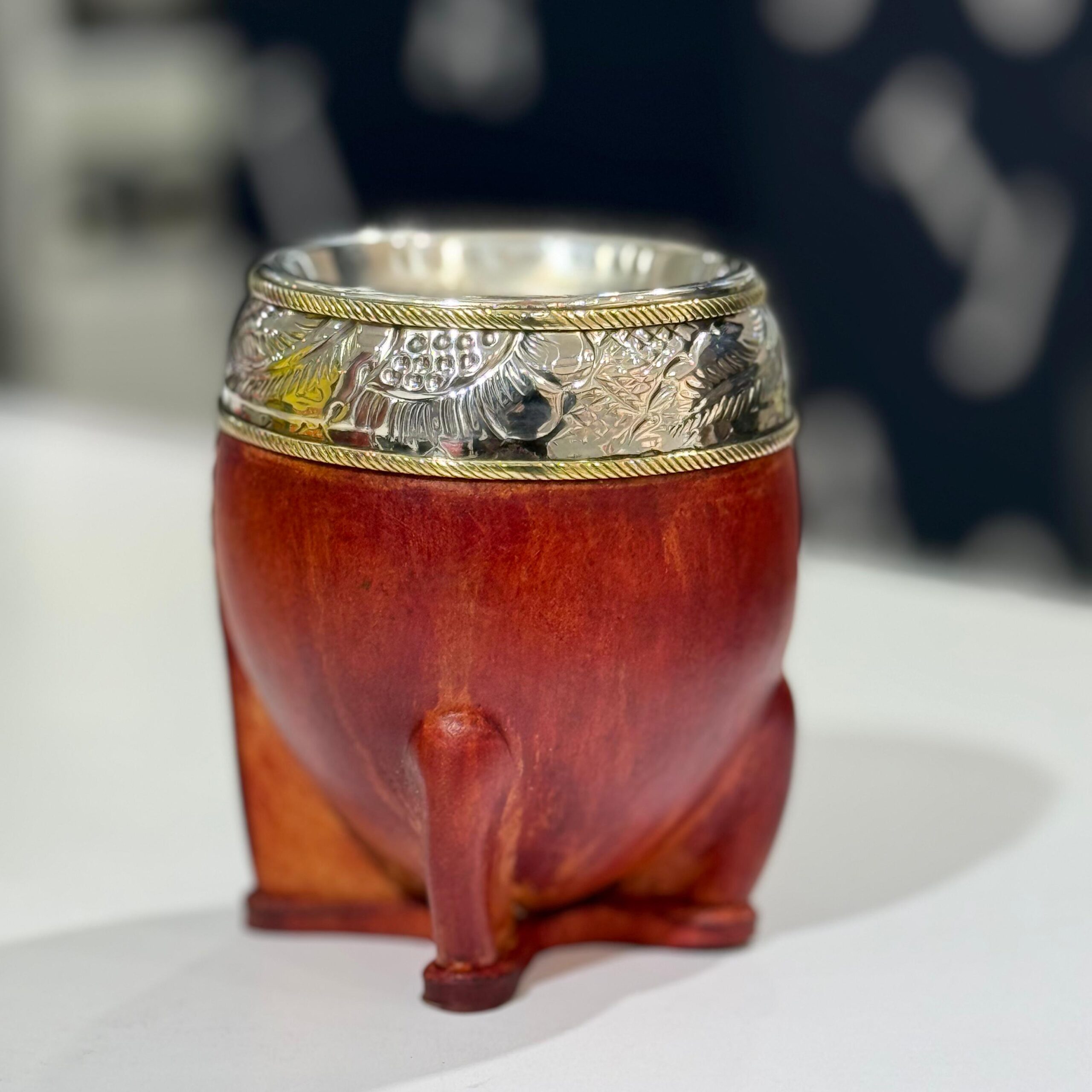 Mate torpedo de calabaza revestido en cuero rojizo, con virola de alpaca cincelada que aporta un detalle único y elegante. Un mate artesanal, resistente y de gran estilo, pensado para realzar cada mateada.